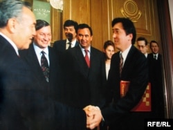 Президент Казахстана Нурсултан Назарбаев поздравляет сына Каришала Асанова - Болата - с участием в международном шахматном турнире, в котором участовал также Анатолий Карпов. Алматы, 2005 год.