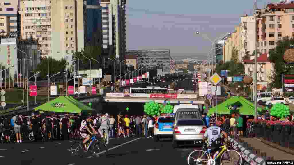 Костюмированный велопробег стартовал в Алматы на проспекте Аль-Фараби и завершился на площади "Астана". По официальной информации, в этом велопараде приняли участие более тысячи горожан. Алматы, 7 сентября 2014 года.