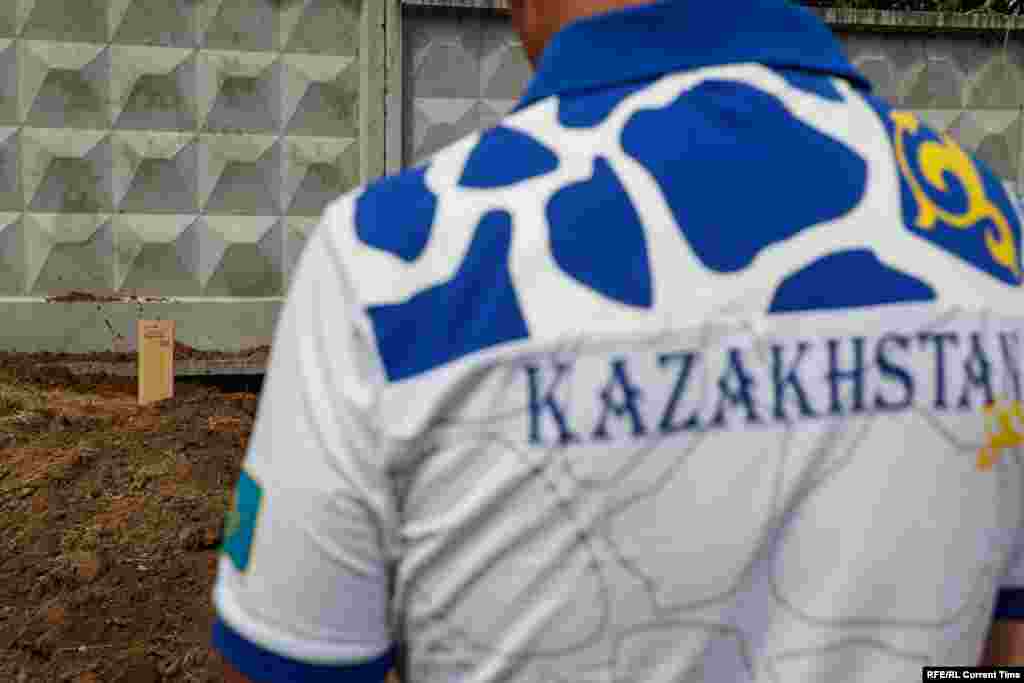 На фото: Марат Дарменов накрывает флагом Казахстана могилу Айдоса Садыкова, Киев, 5 июля 2024 года