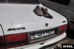 Автомобиль «Волга» Габидоллы Шолакова, на которой он приехал к зданию прокуратуры и его обгоревшие сандалии. Атырау. 26 мая 2009 года.