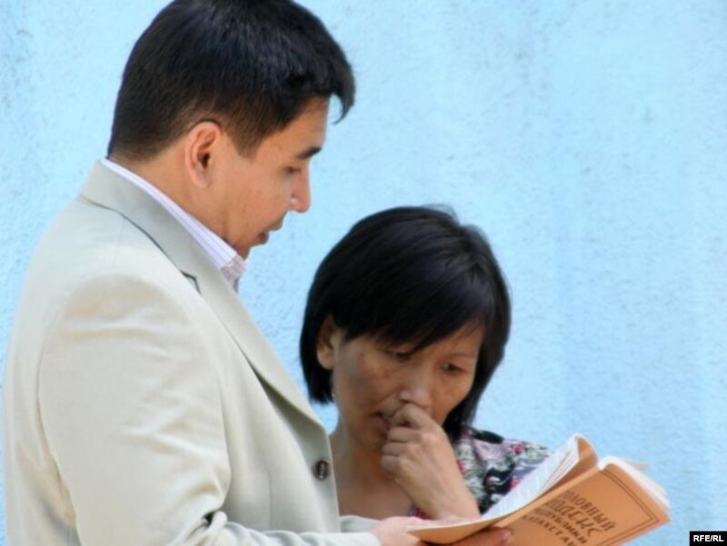 Адвокат Бахыт Бименов и Зоя Нарымбаева, жена активиста оппозиции Ермека Нарымбаева, читают Уголовный кодекс около здания Алматинского городского суда. Алматы, 19 мая 2010 года.