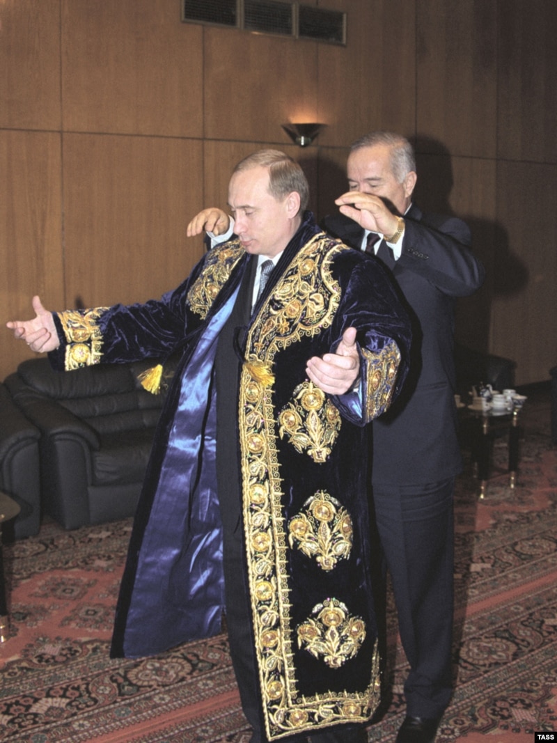 Президент Узбекистана Ислам Каримов дарит чапан премьер-министру России Владимиру Путину. Ташкент, 12 декабря 1999 года.