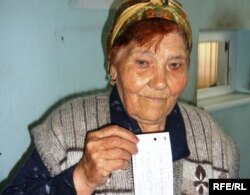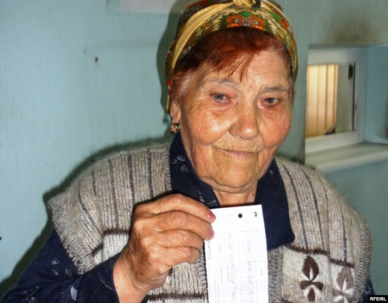 Пенсионер Фаина Шырбаева показывает квитанцию об оплате коммунальных услуг, некоторые из них подорожали. Шымкент, 15 мая 2009 года.