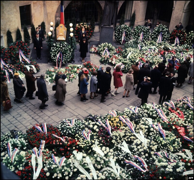 Церемония прощания с чешским студентом Яном Палахом в Карловском университете, который сжег себя, протестуя против советской оккупации. Прага, 25 января 1969 года.