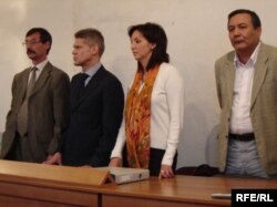 Правозащитник Евгений Жовтис, его адвокаты Виталий Воронов, Вера Ткаченко и общественный защитник Дос Кошим слушают тюремный приговор Жовтису. Баканас, 3 сентября 2009 года.