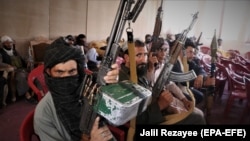 Еще одна фотография, датируемая 23 июня и сделанная в районе Гузара на западе провинции Герат, изображает афганцев, поклявшихся сражаться вместе с силами безопасности страны против талибов