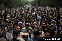 Около 500 жителей района Гузара, взявшие в руки оружие для борьбы с талибами, 23 июня идут с афганскими солдатами