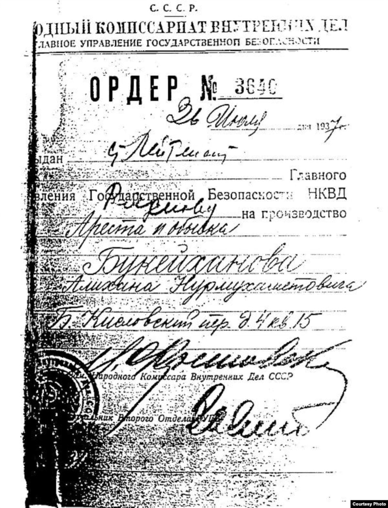 Алихан Букейхан был арестован в последний раз и заключен в Бутырку 26 июля 1937 года, о чем свидетельствует первый документ из архива ФСБ - ордер под № 3640. Его квартира, точнее то, что от нее осталось (угловая комната), была подвергнута обыску.