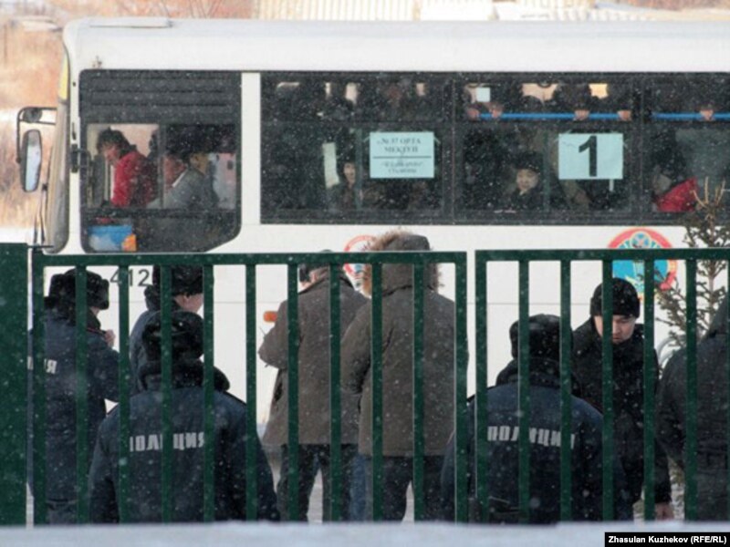 Кордон полицейских регулирует посадку болельщиков в автобус в день открытия Азиады. Астана, 5 февраля 2011 года.