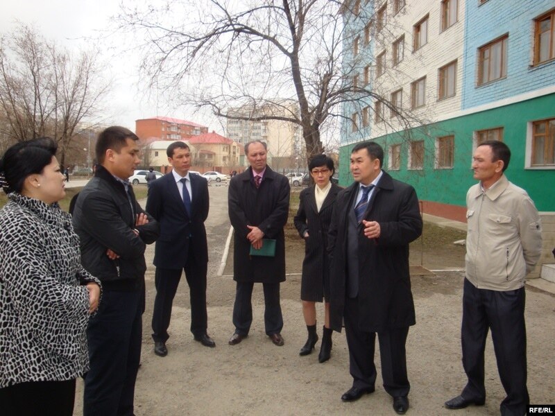 Комиссия из чиновников и членов партии «Нур Отан» во дворе университета. Атырау, 10 апреля 2010 года.