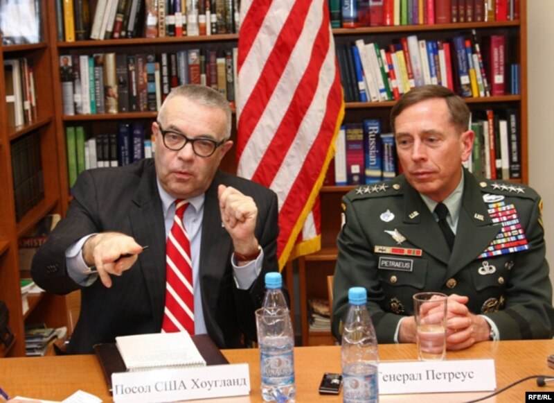 Посол США в Казахстане Ричард Хоугланд и генерал США Дэвид Петреус на пресс-конференции в Астане. 5 апреля 2010 года.