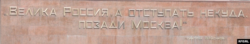 Слова из призыва политрука Клочкова - фрагмент монумента 28 гвардейцам-панфиловцам. Алматы, 23 февраля 2010 года.