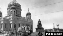 Бронзовый памятник был обезглавлен, а затем демонтирован в 1918 году. Собор на заднем плане тоже был разрушен советскими властями, которые пропагандировали атеизм. В 1990-х годах памятник был восстановлен.