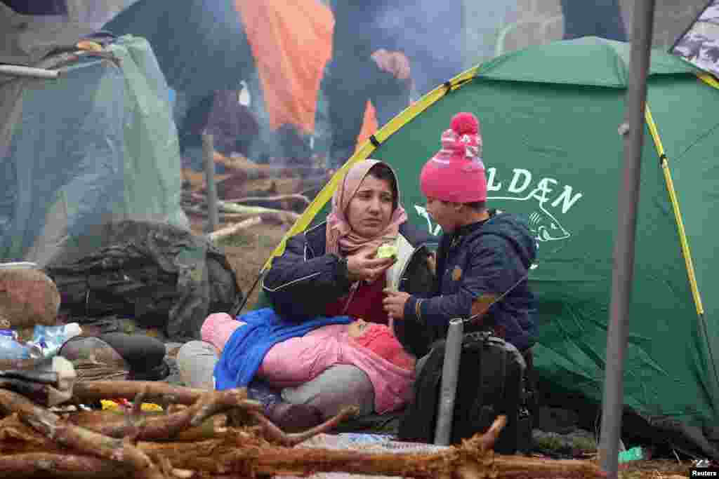 Мигранты получают гуманитарную помощь, доставленную членами Белорусского общества Красного Креста и белорусского Совета Республики недалеко от белорусско-польской границы в Гродненской области, Беларусь 10 ноября 2021 года