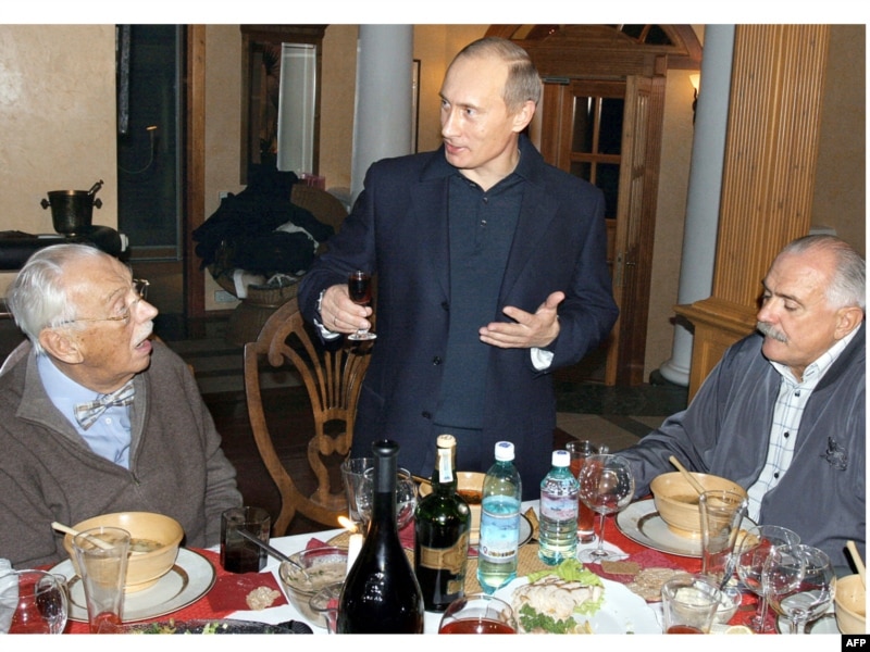 Владимир Путин в бытность президентом России поздравляет режиссера Никиту Михалкова (справа) с 60-летним юбилеем. Москва, 21 октября 2005 года.