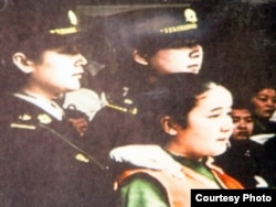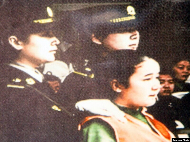 Фотография из брошюры Кахармана Кожамбердиева "Урумчинская трагедия: 5 июля 2009" с изображением 17-летней уйгурской девушки Хайренсы Савут, приговоренной к смертной казни.
