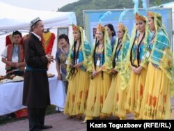 Девушки из уйгурского культурного центра выступают перед гостями на форуме министров иностранных дел стран - членов ОБСЕ. Курорт "Ак-Булак", Алматинская область. 17 июля 2010 года.