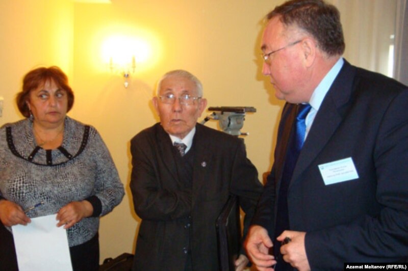 Слева направо: атырауские экологические активисты Галина Чернова и академик Муфтах Диаров, директор Казахстанского научно-исследовательского геологоразведочного института Косан Таскинбаев. Атырау, 19 ноября 2010 года.