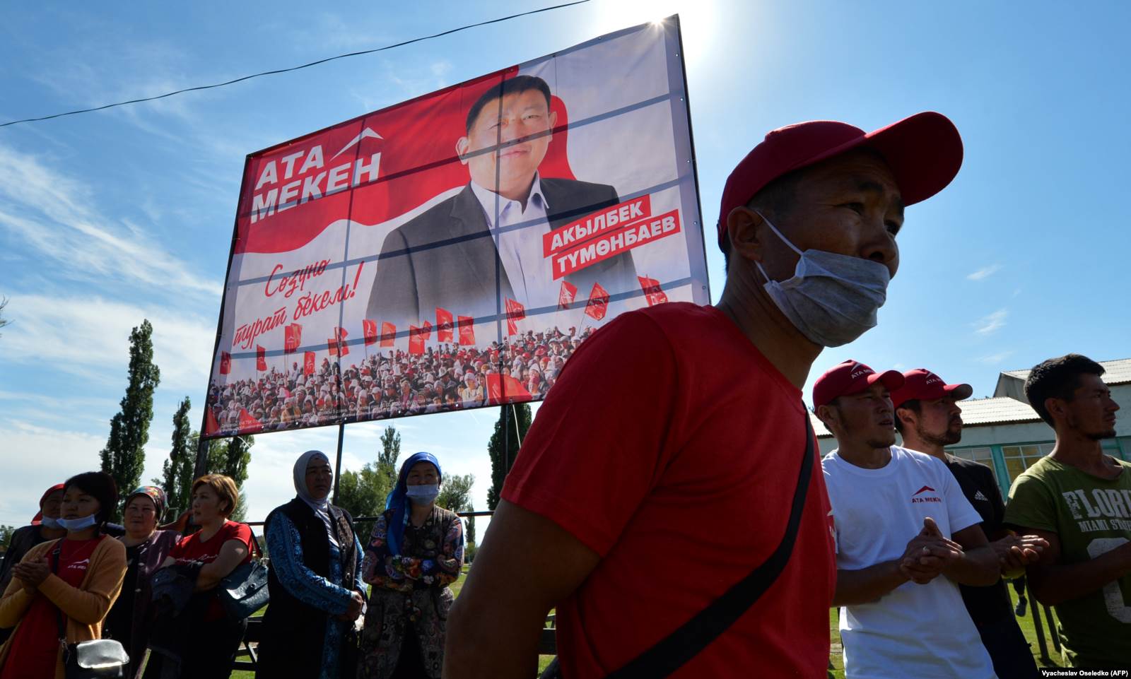 Люди на предвыборном митинге партии "Ата-Мекен" в селе Тон примерно в 360 км от Бишкека, 8 сентября 2020 года.