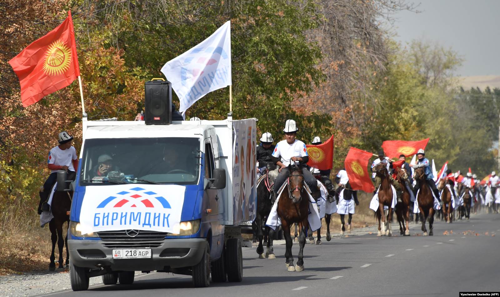 Сторонники проправительственной партии "Биримдик" (Единство) в национальных шапках и с флагами едут верхом по дороге во время кампании в селе Кой-Таш примерно в 20 км от Бишкека, 2 октября 2020 года.