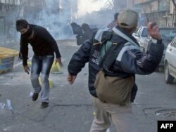 Участники антиправительственной демонстрации бросают камни в полицию. Тегеран, 14 февраля 2011 года.