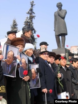 У памятника Шокана Уалиханова. Люди пришли помянуть Алтынбека Сарсенбаева. Алматы, 27 февраля 2006 года.