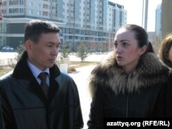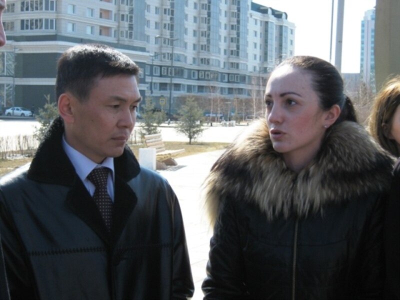 Заместитель председателя комитета уголовно-исполнительной системы Ескали Саламатов (слева) говорит с родственницей осужденного. Астана, 1 апреля 2011 года.