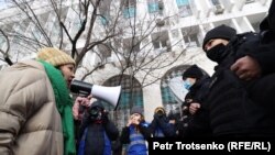 Прибывший на место аким Медеуского района Алматы Асет Масабаев в комментарии Азаттыку сказал, что действия вышедших на протест, по его мнению, нарушают закон и общественный порядок.