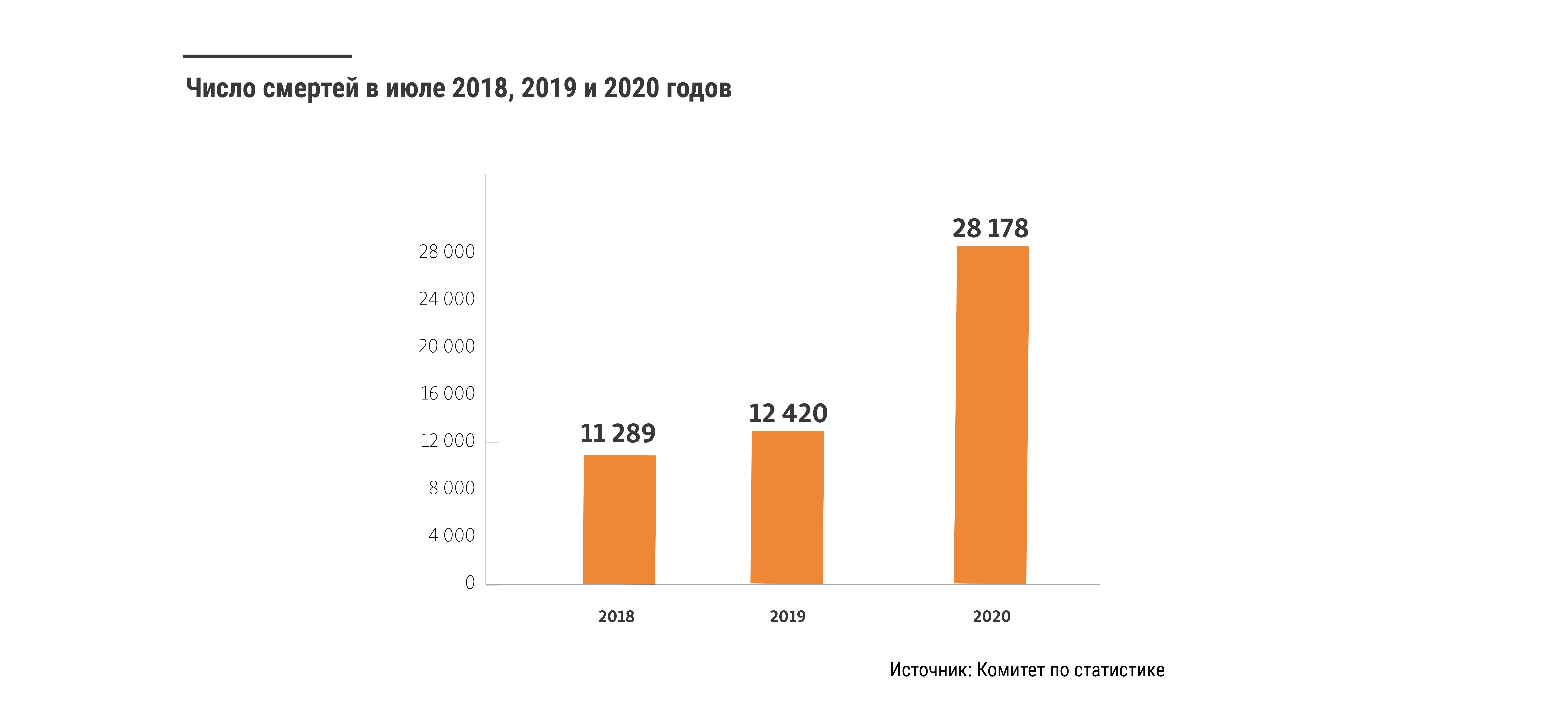 По данным комитета по статистике, количество умерших в Казахстане в июле этого года увеличилось в несколько раз по сравнению с предыдущими годами. В июле 2018 года в стране скончалось 11 289 человек, в июле 2019 года — 12 420 человек, в июле 2020 года — 28 178 человек. По официальным данным, число скончавшихся в июле этого года более чем в два раза превышает показатель прошлого года — на 15 758 больше потерянных жизней. Согласно официальной статистике, лишь 870 человек — это люди, умершие от коронавируса в этот период.