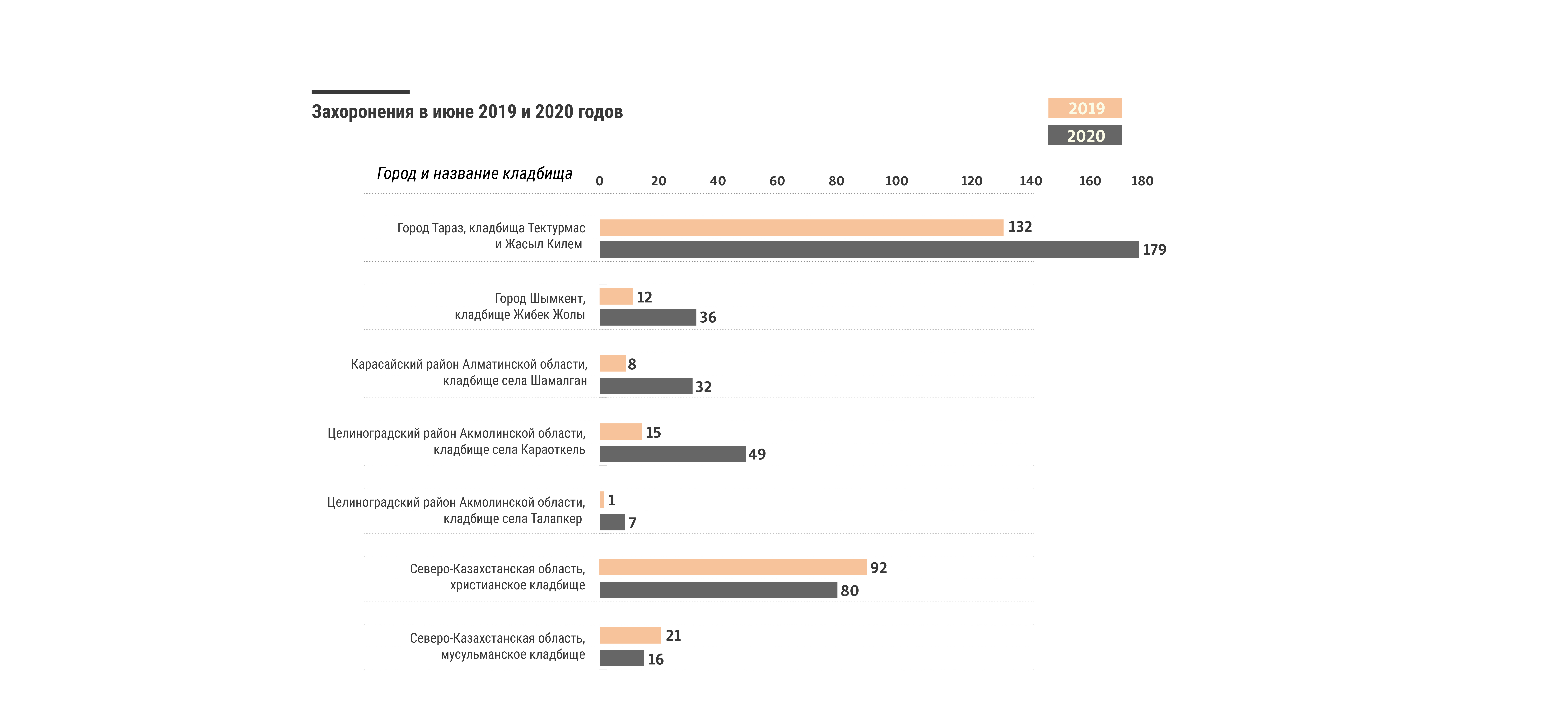 Всего на семи кладбищах, посещенных репортерами Азаттыка, количество захороненных в июне 2020 года увеличилось примерно на 189 процентов по сравнению с июнем 2019 года.