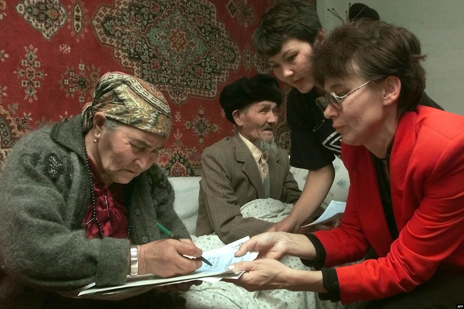 Пожилые люди заполняют избирательные бюллетени, предоставленные членами комиссии, пришедшими на дом. Коргалжын, октябрь 1999 года.