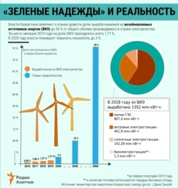 Из возобновляемых источников производится менее 2 процентов от общего объема вырабатываемого в Казахстане электричества. Более 98 процентов электроэнергии производится за счет сжигания угля и углеводородов.