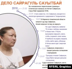 В апреле 2018 года Сайрагуль Сауытбай незаконно пересекла границу через пост «Хоргос», находящийся на китайско-казахстанской границе. В середине мая она была задержана сотрудниками комитета национальной безопасности и водворена в следственный изолятор в Талдыкоргане.