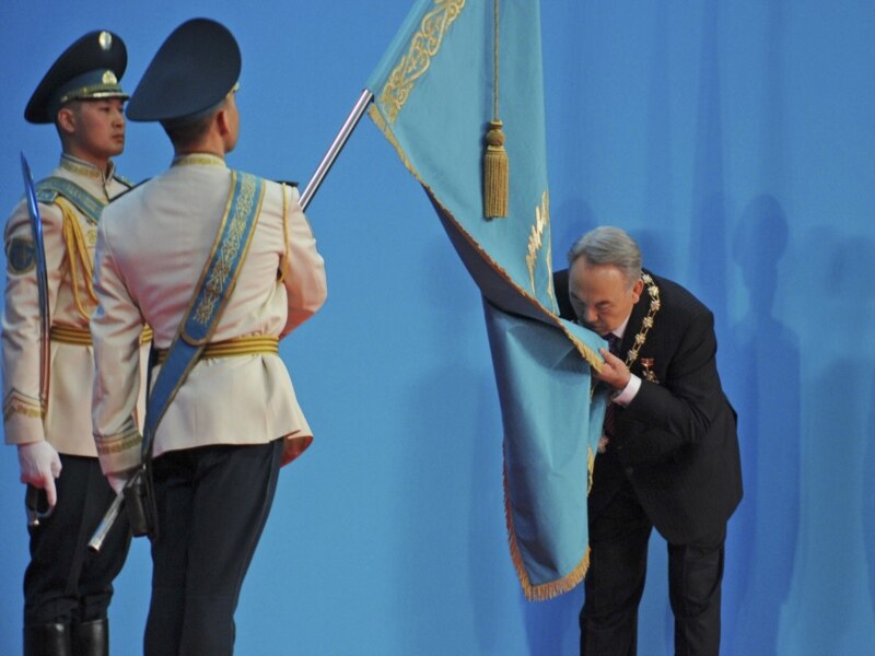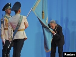 Президент Казахстана Нурсултан Назарбаев целует флаг Казахстана на церемонии инаугурации. Астана 8 апреля 2011 года.