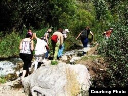 Туристы поднимаются по горной трапе в Тургеньском ущелье Иле-Алатауского национального парка. Август, 2010 год.