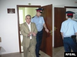 Полицейские выводят писателя Алпамыса Бектурганова в наручниках из зала суда. Уральск, 13 августа 2009 года.