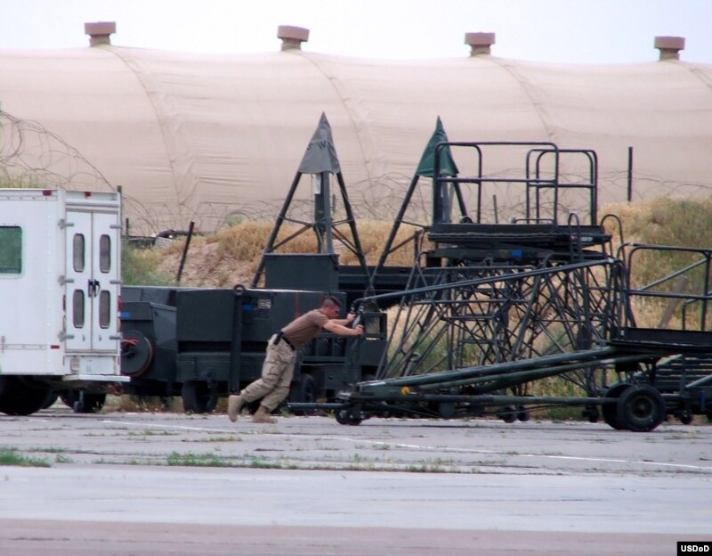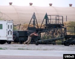 Американский сержант Брайн Фентресс движет оборудование на авиабазе "Ханабад" в узбекском городе Карши.