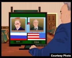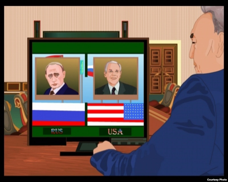 Премьер-министр Карим Масимов стоит перед президентом Нурсултаном Назарбаевым. Кадр из мультфильма «Сапа Олимпиадасы» («Олимпиада качества»), Снимки предоставила студия «Жебе» из Шымкента, где был снят мультфильм.