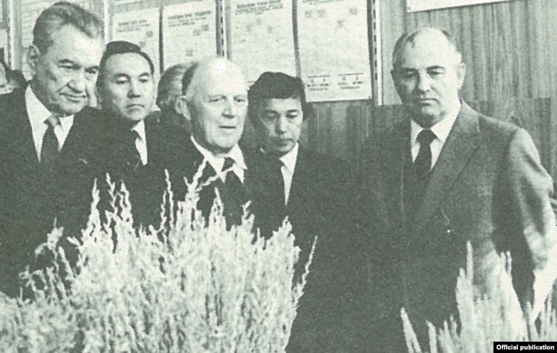 Первый секретарь ЦК Компартии Казахстана Динмухамед Кунаев, председатель Совета министров Казахской ССР Нурсултан Назарбаев (слева крайние), генеральный секретарь ЦК КПСС Михаил Горбачев (крайний справа). Целиноград, 1985 год.