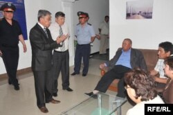 Заместитель прокурора Атырауской области Хабиболла Касымов и первый заместитель начальника ДВД Жанболат Ульжабаев общаются с родственниками Кабидоллы Шолакова в областной прокуратуре. Атырау, 26 мая 2009 года.