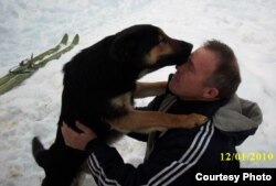 Житель города Текели Алматинской области Ренат Минибаев со своей собакой. Фотография из семейного архива. 12 января 2010 года.