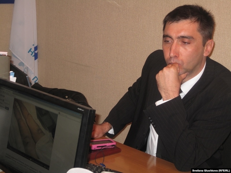 Гражданский активист Вадим Курамшин показывает видео, на котором видны синяки на теле погибшего заключенного Армана Капарова. Астана, 3 октября 2011 года.