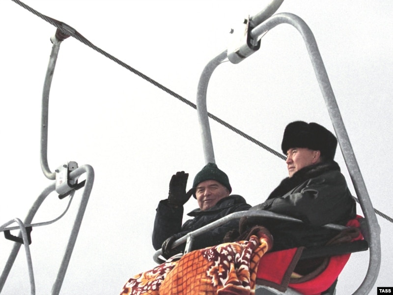 Президент Узбекистана Ислам Каримов и президент Казахстана Нурсултан Назарбаев в горах близ Алматы. Шымбулак, 8 января 2001 года.