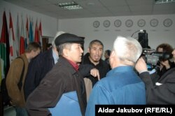Председатель союза журналистов Сейтказы Матаев пытается успокоить активиста движения "Желтоксан-86" Талгата Рыскулбекова (в центре), который сорвал пресс-конференцию оппозиционеров в Национальном пресс-клубе. Алматы, 27 октября 2010 года.